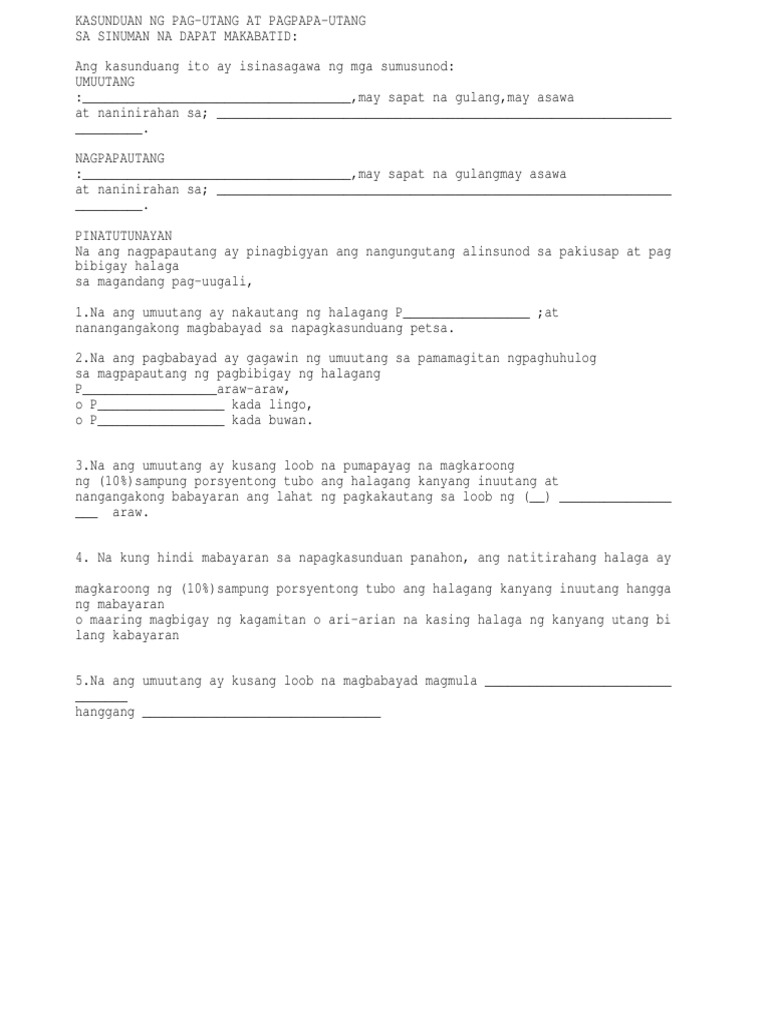 Kasunduan Sa Pagpapautang Format Kasunduan Sa Pagpapautang Docx Kasunduan Sa Pagpapautang Ako Si May Asawa Kay May Sapat Na Gulang At Naninirahan Sa Sa Harap Ng Kasulatan Na Ito Ay Course from i1.wp.com 8ago pirmahan ang anumang kasulatan, kailangang mayroong kasunduan na maari ninyong bawiin ang inyong pera. Kailangang naiintindihan ang lahat ng impormasyon 0 detalye tungkol sa negosyong papasukan. 8ago makisapi sa isang negosyo, humingi ng mga prospektus, katalogo, legal na dokumento, at kasulatan ukol sa pinansyal na kalagayan ng kompanya.